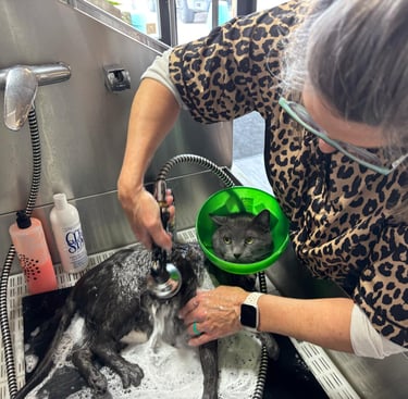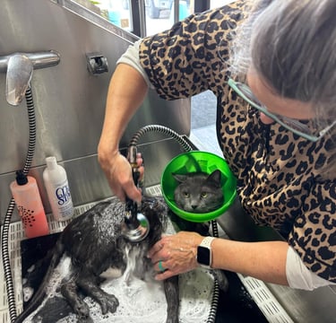 Let's get your hairless kittly looking and feeling great with a good degreasing bath. It's toes will be squeaky clean with a good scrub and exfoliation to remove oil build up around the claws. Then on to more pampering with wrap in a heated, plush towel for a gentle dry. Your kitty will also get their nails trimmed as well as eyes and ears cleaned.